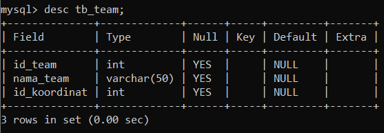 Membuat tabel dengan field yang berisi => id_team,nama_team,id_koordinat.